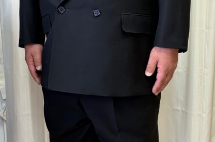 5月から大阪の地で心機一転営業職に転職するというI様。1着きちんとしたスーツをと当店でお求めになられました。筋トレが趣味とのことでボディビルターとそん色ない体型、これからさらに筋肉がついても大丈夫なようにと若干ゆとりのつくりにもご満足いただきました。
