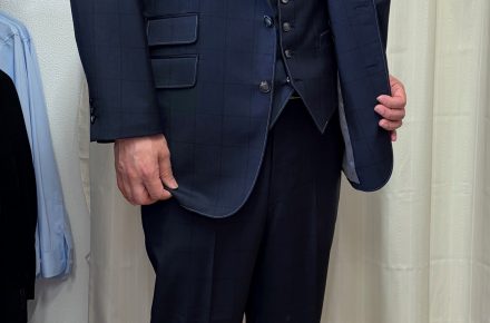 ご主人へ丁度良いサイズの礼服をとのことで初めてご来店いただきましたH様。礼服専用の児玉毛織のウルトラブラック生地をスリーピースにとご注文いただきました。仕上がりを試着、丁度良いサイズは着やすく丁寧な作りにもご満足いただきました。「良いお店をみつけた。」と当店を後にしました。ありがとうございます。
