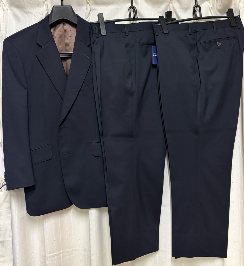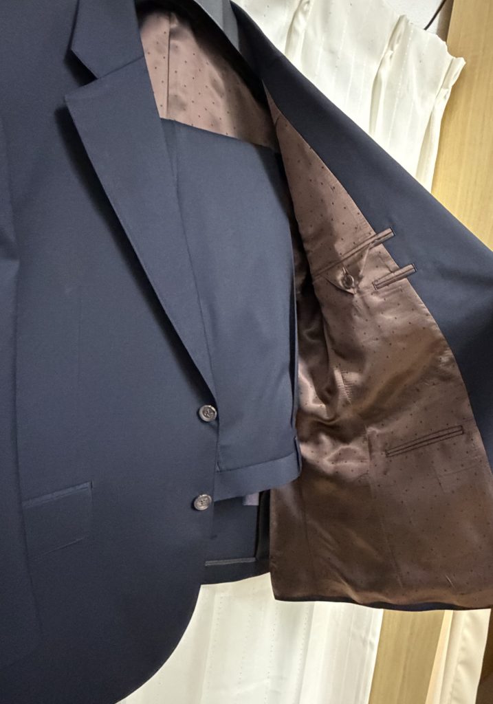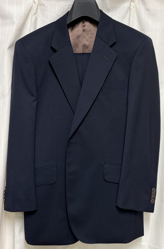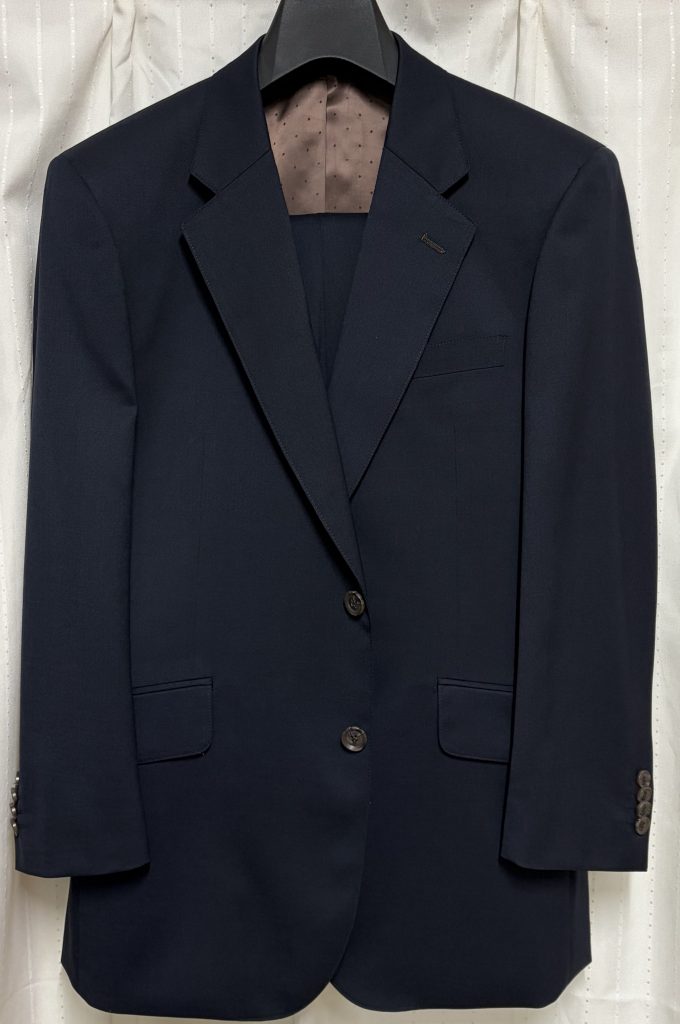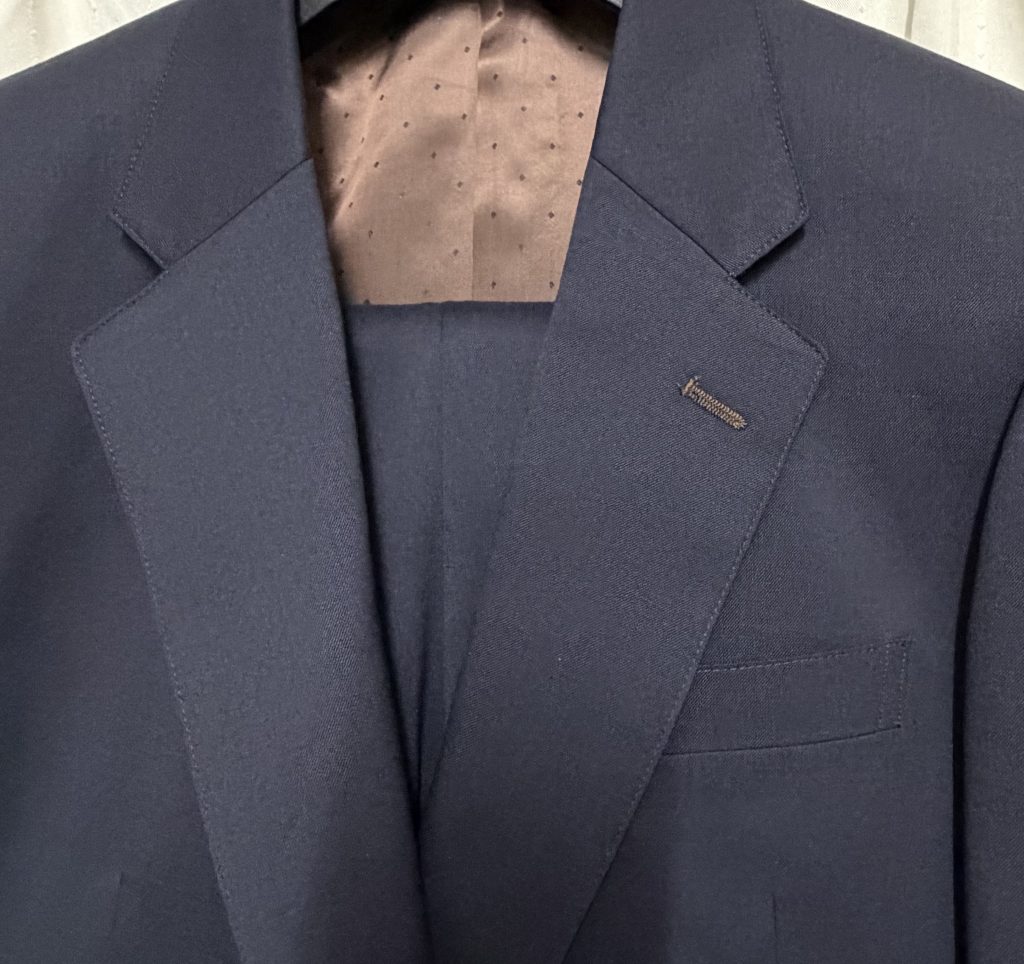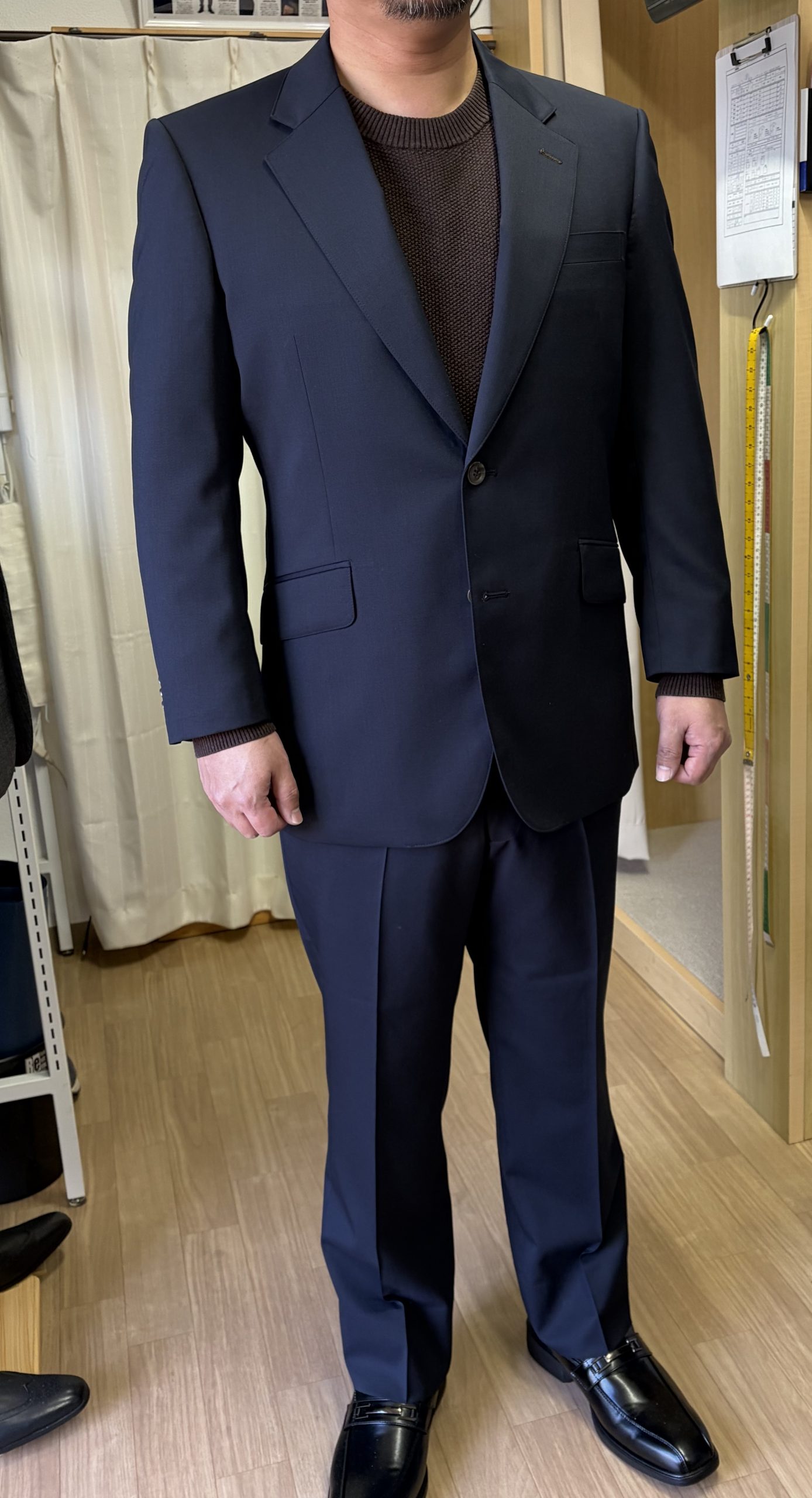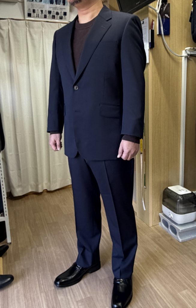 初めてのオーダースーツです。生地はオールシーズンのソリッド+のネイビー。釦や裏地またフラワーホールも茶系にいたしました。完成したスーツを試着すると「とても着やすくて軽く感じます。」とのこと。思いのほかの着心地にご満足いただきました。