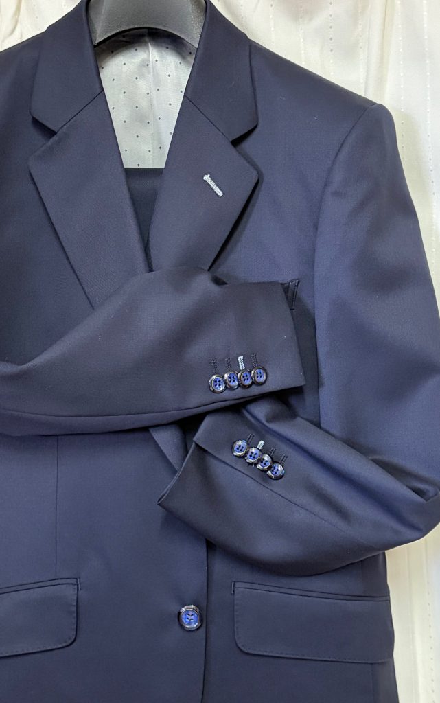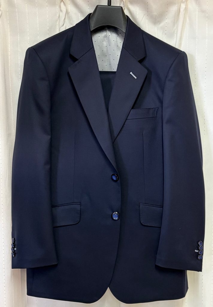 いつもご利用いただいていますE社長様、仕事柄いろいろな式典に出席することが多いのことです。今回は良い質感のネイビースーツがいいとのことで、選ばれた生地は長大スーパーテックスのオールシーズン生地。良い生地にはハイグレード仕立て、裏地もボタンも良いものでコーディネートいたしました。完成品は一目見て良いものとわかります。いつもご利用ありがとうございます。