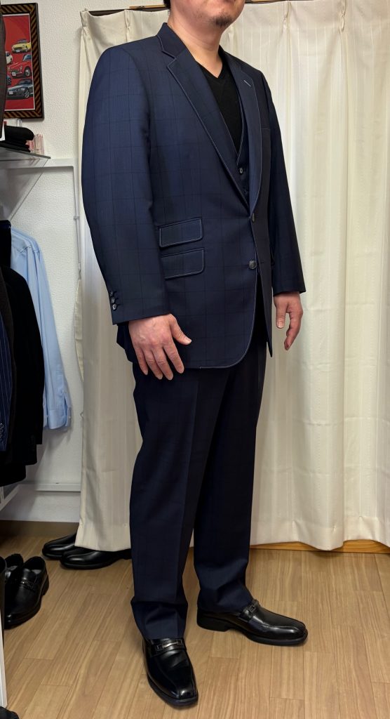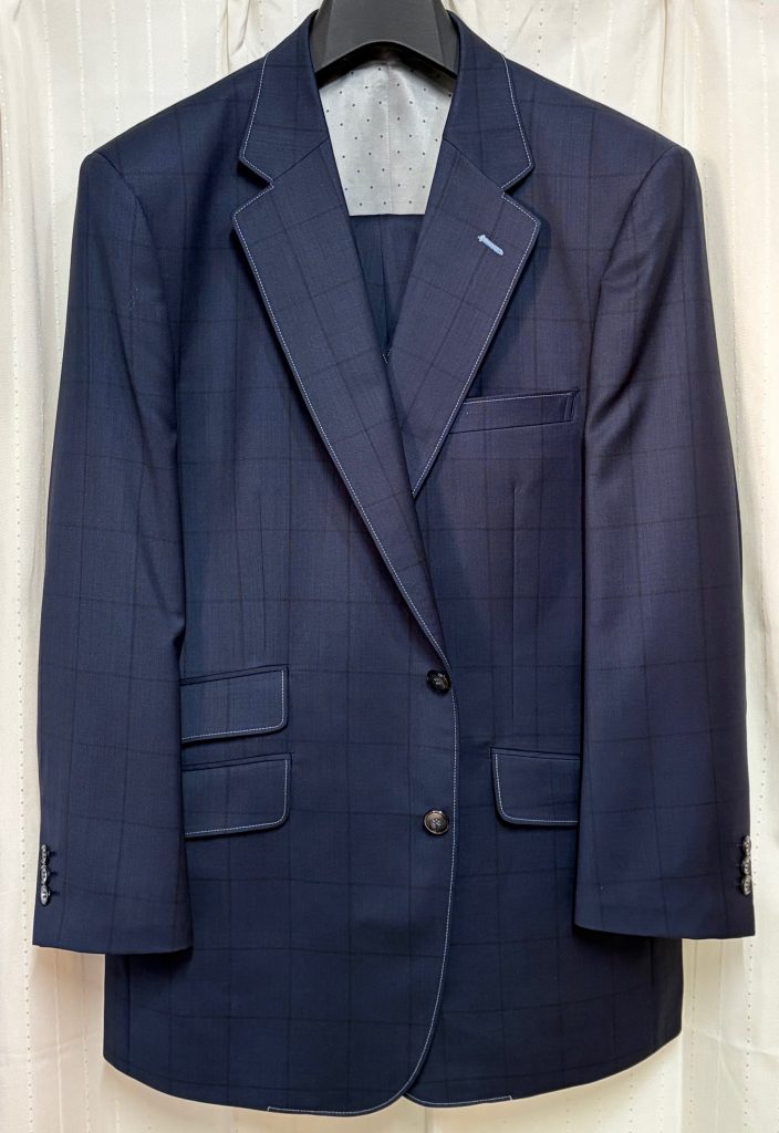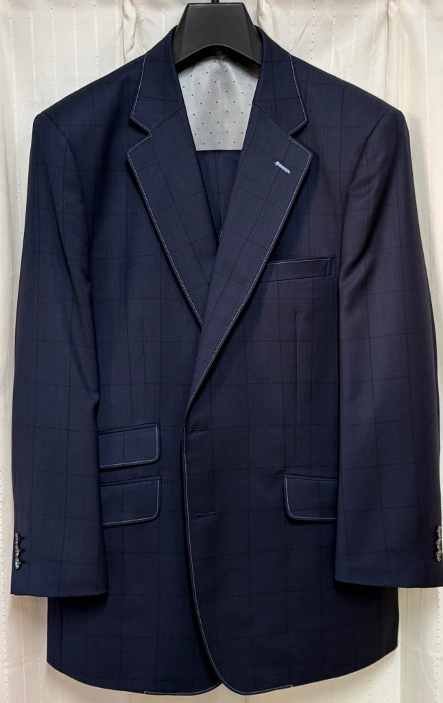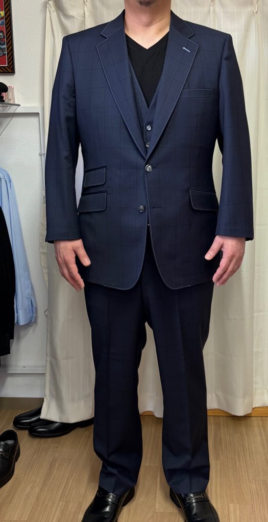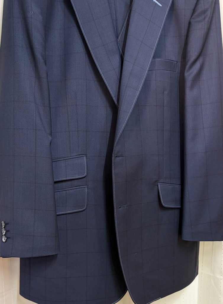 初めてのご来店いただきましたK様。モデルはブリティッシュトラッドをご希望なされました。生地はイタリア産ビエラのネイビー・ウィンドーペンです。体型の大き目な方には丁度合う柄になります。その生地をスリーピースにして個性的にとステッチや釦ホールに色糸を使いました。ボタンも裏地もオリジナルを加えました。ブリティッシュトラッドにはチェンジポケットは必須アイテムです。試着すると思わず笑みが出る仕上がりと着心地でした。