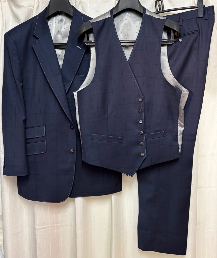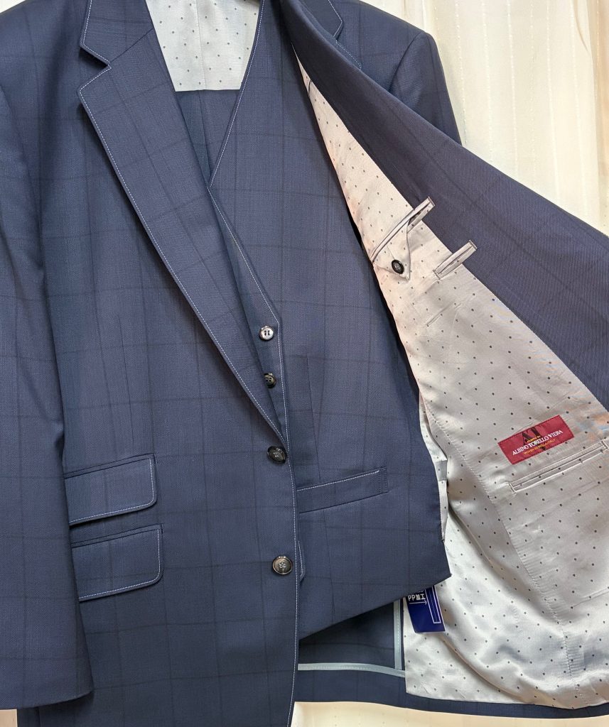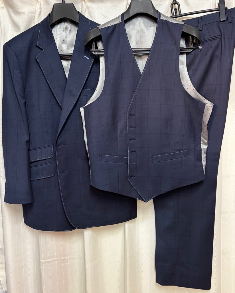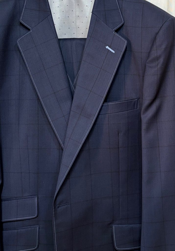 初めてのご来店いただきましたK様。モデルはブリティッシュトラッドをご希望なされました。生地はイタリア産ビエラのネイビー・ウィンドーペンです。体型の大き目な方には丁度合う柄になります。その生地をスリーピースにして個性的にとステッチや釦ホールに色糸を使いました。ボタンも裏地もオリジナルを加えました。ブリティッシュトラッドにはチェンジポケットは必須アイテムです。試着すると思わず笑みが出る仕上がりと着心地でした。