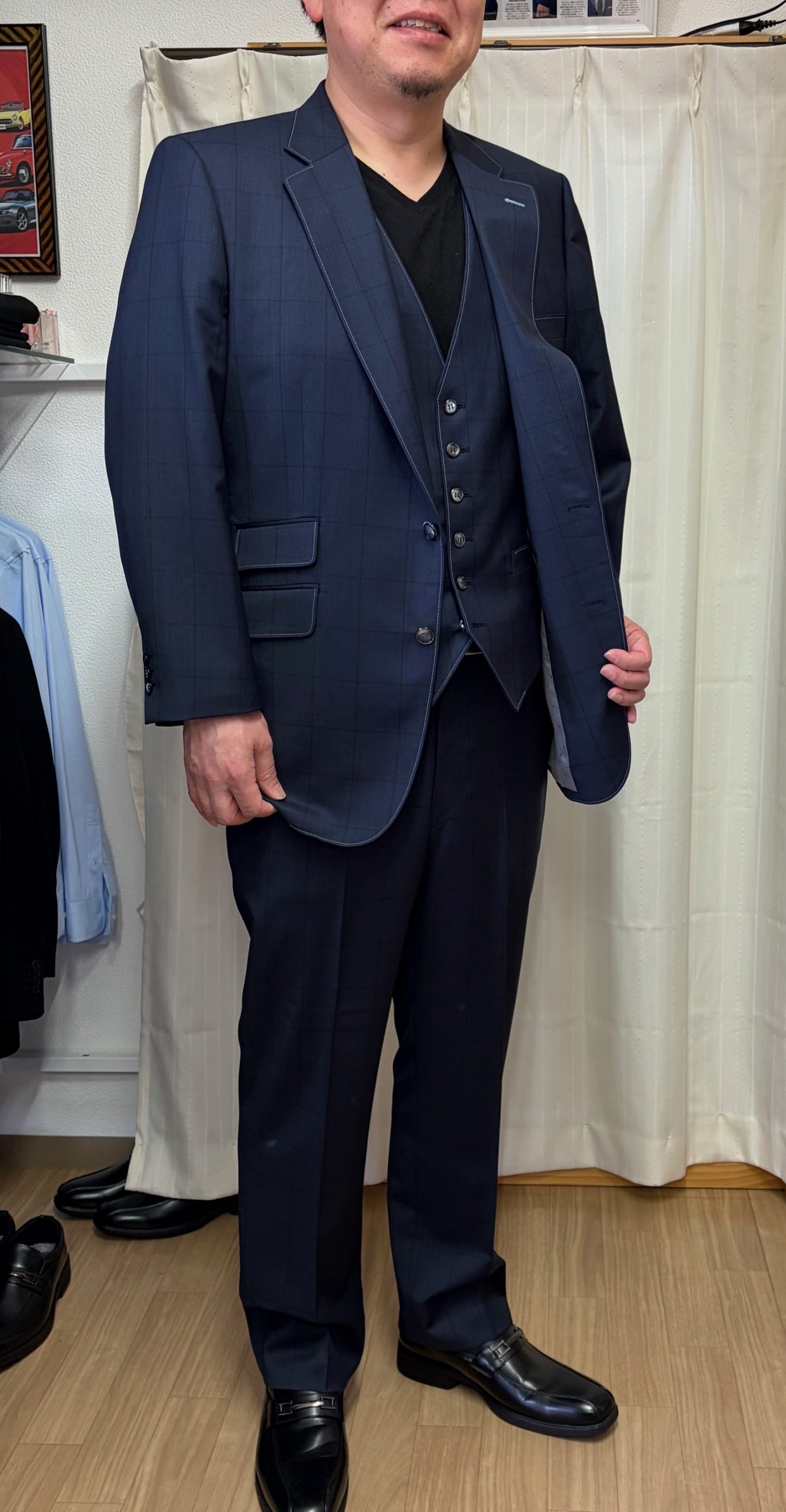 初めてのご来店いただきましたK様。モデルはブリティッシュトラッドをご希望なされました。生地はイタリア産ビエラのネイビー・ウィンドーペンです。体型の大き目な方には丁度合う柄になります。その生地をスリーピースにして個性的にとステッチや釦ホールに色糸を使いました。ボタンも裏地もオリジナルを加えました。ブリティッシュトラッドにはチェンジポケットは必須アイテムです。試着すると思わず笑みが出る仕上がりと着心地でした。